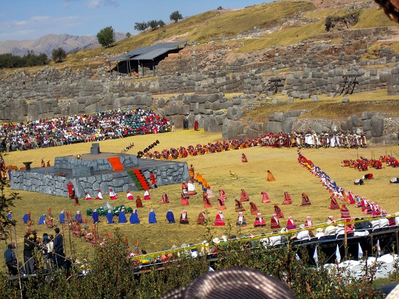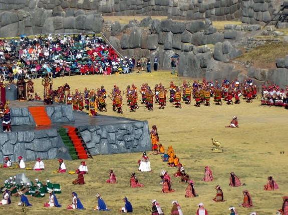 During Inca times, approximately 25,000 people would gather in Cusco to celebrate the festival of Inti Raymi. The Sapa Inca, nobles, priests and headmen of the Inca Empire would gather in Haukaypata to a witness a parade of cloth wrapped ancestral mummies that were brought from nearby temples and shrines. As many as 200 hundred llamas would be sacrificed during the festivities and the Haukaypata ran with sacred blood and plentiful chicha (the Inca beer). The festivities took place from dawn to dusk. There were special dances and coca leaves were read and burnt in great quantities. Inti Raymi was the greatest Inca festival of the year and everyone who attended became drunk with spiritual communion.