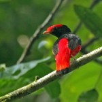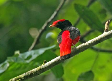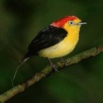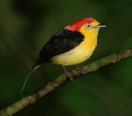 This manakin has a long filament in the tail which the male uses to strike his partner during the courtship ritual.