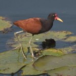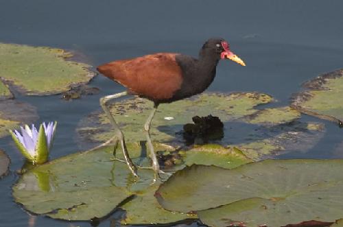 Foraging at the edge of an oxbow lake in Manu Biosphere Reserve, the wattled jacana is unusual in that the female takes more than one mate, lays several clutches eggs and leaves the males to rear the young.