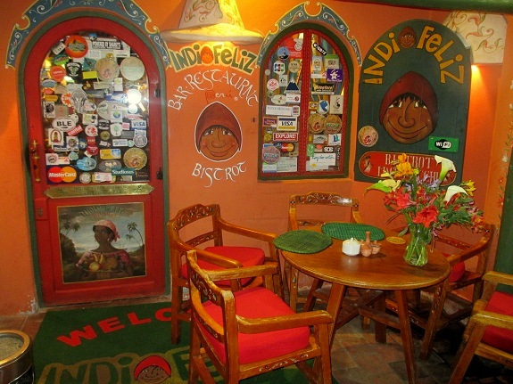 Indio Feliz is a large restaurant located on a side street close to the main plaza in Aguas Calientes (Machu Picchu Pueblo). Its name meaning “Happy Native,” was given to the restaurant by its French owner Patrick, inspired by the amount of happy locals wandering the streets of Aguas Calientes when he first arrived in the town in the 1980’s. The restaurant covers 2 floors with 4 individual dining rooms. The décor is unique in design, and features many hand crafted individual items procured in Peru and around the world. Indio Feliz offers a set 3-course menu (with many options), or diners can pick individual plates from the menu. A full selection of soft and alcoholic beverages (including an extensive wine list) is also available.