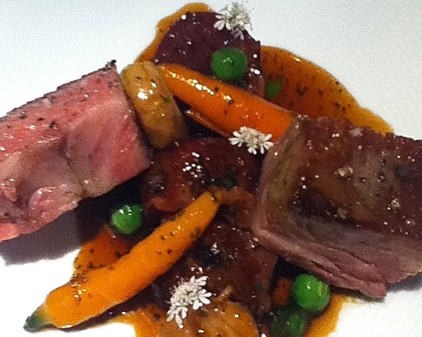 The first meat course was confit and ragout of guinea pig served with mini black corn pancakes with which we were encouraged to construct a kind of sophisticated Peruvian fajita. It worked well and would be an excellent way for the uninitiated to lose their cuy virginity. The second meat course consisted of short rib of beef with bone marrow, accompanied by carrots, peas and native potatoes, decorated with pretty and intensely flavoured parsley flowers.